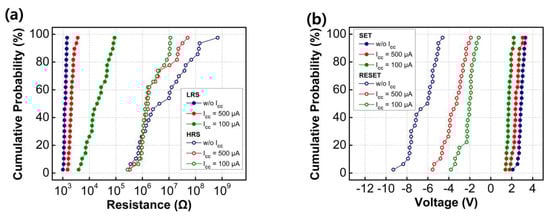 Figure 4a illustrates the cumulative distribution function of the resistance states of the fabricated RRAM devices, programmed by setting different current compliance levels with a read voltage of +0.1 V. With decreasing current compliance values, the fabricated RRAM devices showed the gradual resistance switching characteristics, indicating the formation of OV and Ag metal-mixed CFs between two electrodes. This led to the formation of intermediate resistance values within the LRS and HRS, rendering them suitable for MLC switching. The LRS values are influenced by factors such as the radius of the CFs or the concentration of filaments between the bottom and TEs [26,27]. When a low compliance current is applied to the device, the formation of CFs is suppressed, leading to narrower CFs and a slight increase in the resistance of the switching layer. This phenomenon cannot occur when the conductive filament contains pure Ag filament. Conversely, the HRS values did not exhibit considerable changes, irrespective of the set current compliance value. The HRS values are known to be affected by the distance between the top of the broken CF and the TEs, known as the rupture region distance. The fact that the fabricated Y2O3 RRAM devices did not show considerable HRS variation indicates that the rupture region distance between the top of the broken CF and the TEs was unaffected by the set current compliance values.