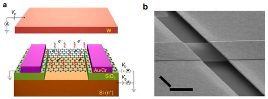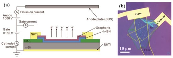 - Wu, G.; Wei, X.; Gao, S.; Chen, Q.; Peng, L. Tunable graphene micro-emitters with fast temporal response and controllable electron emission. Nat. Commun. 2016, 7, 11513. [Google Scholar] [CrossRef] [PubMed]