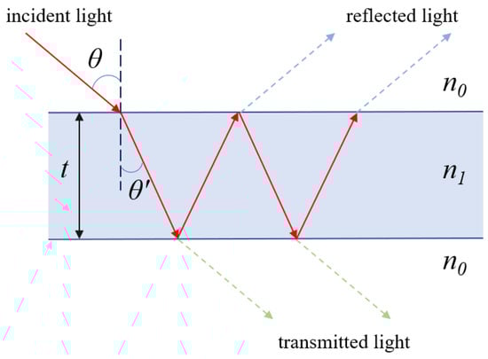 The light-guiding mechanism of HC-ARF is based on the anti-resonant reflecting optical waveguide (ARROW) model, which is a flat-plate waveguide theory. Initially, in 2002, Litchinitser et al. used this theory to explain the principle of light conduction in Kagome fibers [31]. The principle of anti-resonant light-guiding is shown in Figure 2, when a beam of light is incident into an air core, the surface of the glass wall is approximated as a grazing incidence, and part of the light is emitted and returned to the core; the other part of the light is refracted and enters the glass wall, forming a Fabry–Perot-like resonant cavity in the glass wall. The wavelength of the incident light and the thickness of the glass wall determine the resonance conditions and anti-resonance conditions of the resonant cavity, and the light that meets the resonance conditions is leaked out, while the light that does not meet the resonance conditions through the anti-resonance effect back into the fiber core propagation, through this principle can be limited to the light propagation in the air fiber core. Snell’s law and the Fabry–Perot cavity principle can be deduced from the antiresonance conditions as follows: