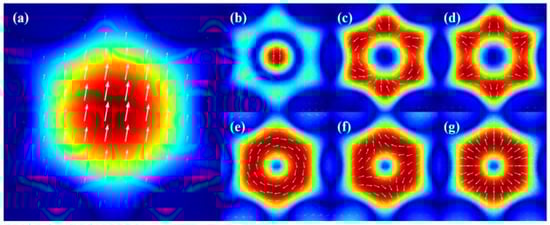 By a multipole analysis, the far-field radiation intensity and distribution of the two mode multipoles are shown in Figure 8. It can be seen that mode I is mainly dominated by MD and EQ in Figure 8a, the magnetic dipole can be considered as the “bright mode” of radiation and EQ as the “dark mode”. The destructive interference between them excites the Fano resonance. Therefore, properties such as local field enhancement caused by MD and EQ are among the most important elements to obtain a high Q and high sensitivity. In Figure 8b, it can be seen that mode 2 is dominated by TD and MQ. Unlike electric and magnetic dipoles, toroidal dipoles originate from an electric field oriented along the meridian of the ring surface and a magnetic field oriented along the equatorial line or from a vortex configuration in which the heads and tails of magnetic dipoles are connected [38].