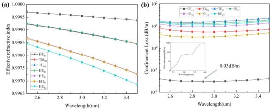 In addition, we calculated the effective refractive index curves with wavelengths from 2500 nm to 3500 nm, as shown in Figure 4a. According to Equation (1), we can calculate the confinement loss of HC-ARF, and we can get the confinement loss curve with the wavelength for each mode, as shown in Figure 4b. Its inset shows the loss spectrum of quartz material, and the data are from Heraeus [33]. The fundamental mode loss of HC-ARF can reach as low as 0.03 dB/m at 2900 nm, so HC-ARF can transmit at a very low loss in the mid-infrared band, while the loss of the quartz material reaches 54 dB/m at 3000 nm, and the loss rises sharply at longer wavelengths. Therefore, conventional single-mode fibers are not suitable for transmission in the mid-infrared band.