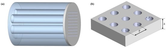 We used an HC-ARF as the transmission medium to achieve light transmission in the mid-infrared band and placed a metasurface on its end face. The 3D schematic diagram of the proposed mid-infrared multifunctional optical device is shown in Figure 1a, which consists of a hollow core anti-resonant fiber (HC-ARF) and a bilayer of silicon nitride (Si3N4) metasurface. Figure 1b shows the cross-section of HC-ARF, which consists of a quartz cladding, six glass tubes, and an air core. The fiber core diameter of the HC-ARF is defined as D, the inner diameter of the cladding tube as d, and the thickness of the glass wall as t. The structure of the metasurface is shown in Figure 1c,d. The bottom and top layers are silicon nitride films, the middle layer is filled with low refractive index PDMS, and finally, the periodic air holes are machined to obtain a bilayer silicon nitride metasurface. The thickness of the silicon nitride film is h1, the thickness of the PDMS film is h2, the period of the air hole is P, and its radius is r.