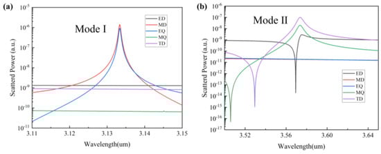 The electric field mode distribution at the resonance alone cannot be observed to accurately determine the mode, because there may be more than one mode at the resonance, and the strong mode will override the weak mode. Therefore, to evaluate the mechanism of both modes’ generation, the far-field radiation of Fano resonance is decomposed into the contributions of multiple components to further discuss their characteristics. These include electric dipole (ED), magnetic dipole (MD), toroidal dipole (TD), electric quadrupole (EQ), and magnetic quadrupole (MQ). We use the multipole decomposition method to calculate the multipole far-field scattering power: