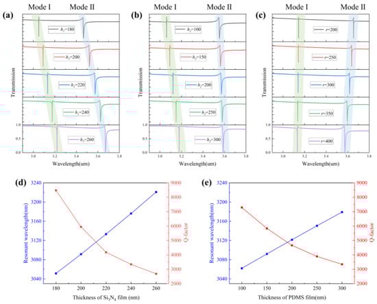 We investigated the effects of several important structural parameters on the transmission spectrum, including the thickness of the silicon nitride film h1, the thickness of the PDMS film h2, and the radius of the air holes r. The spacing between the two metasurfaces is an important parameter for mode coupling. According to the electric field distribution of the two modes, it is known that the electric field of mode I is distributed between and outside the two metasurfaces, while mode II is mainly distributed in the air holes of the metasurfaces. As shown in Figure 9a–c, for the variations of the thickness between the metasurfaces, dip1 has a large offset, while dip2 has no offset. For the variations of the hole radius r, dip1 will have no offset, while dip2 will be affected by the hole size more. As shown in Figure 9d,e, the resonant wavelength and Q-factor of mode I can be obtained as a function of the change in film thickness.