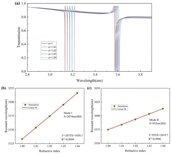 (a) Transmission spectra of modes I and II at different background refractive indices. (b) Resonant wavelength shifts of mode I versus the refractive index. (c) Resonant wavelength shifts of mode II versus the refractive index.