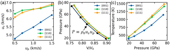 Shock Hugoniot relation for (a) shock wave velocity us vs. particle velocity up, (b) pressure vs. relative volume, and (c) temperature vs. pressure along [001], [110] and [111] directions, respectively. The black dash line in (b) indicates the theoretical Hugoniot pressure curve calculated by the formula: for [001] sample, where is the initial density.