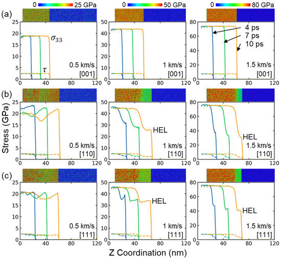 Shock stress and shear stress profile at several moments under different shock intensities along (a) [001], (b) [110], and (c) [111] directions, respectively. Atoms in the inset microscopic views are rendered by the shock stress. HEL indicates the Hugoniot elastic limit.