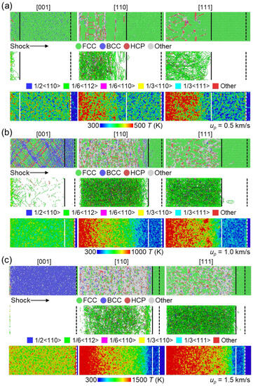 Prior to investigating the shock-induced plasticity, we first presented the shock Hugoniot relations for HEA along different crystalline orientations in Figure 2. The shock wave velocity, referred to as the elastic wave speed, is determined by the propagation distance of the elastic wavefront per unit of time. The Hugoniot pressure and temperature are averaged within a 10 nm slice of the post-shocked region. Figure 2a illustrates the relationship between shock wave velocity us and particle velocity up. The results reveal that the shock wave velocities in the [110] and [111] samples are similar to each other and much higher than those in the [001] samples, regardless of the shock intensities. Figure 2b depicts the relationship between Hugoniot pressure and relative volume. The pressure increases from about 18 GPa to 75 GPa. Comparatively, small pressure increases are observed in the [110] and [111] samples compared to the [001] sample at the same shock intensity. This difference is attributed to the variation in slip systems with non-zero Schmitt factors, wherein the [001] sample possesses more such slip systems than the [110] and [111] samples [22]. The presence of fewer of these systems contributes to a lower plastic deformation rate, resulting in a weaker relaxation of stress [18]. Consequently, the Hugoniot pressure is the lowest in the [001] sample and higher in [110] and [111] samples. The theoretical Hugoniot pressure curve for the [001] sample is estimated using the formula: , where represents the initial density (~7.88 g/cm3). The predicted results strongly align with our MD simulation results, thus confirming the accuracy of this study. The shock temperature rises as the shock pressure increases for all loading directions, as depicted in Figure 2c. Nevertheless, at high shock intensity, the discrepancy between the [001] sample and the [110] or [111] sample is greater than that at low shock intensity. This difference is attributed to the development of plastic deformation.