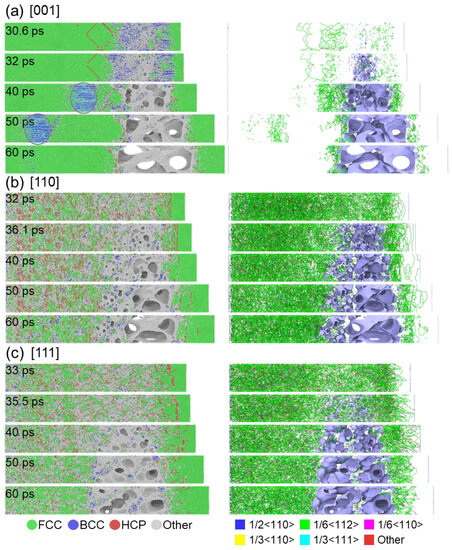 To further investigate the spall damage process, Figure 7 presents the evolution of microstructure and the process of void nucleation for samples oriented in [001], [110], and [111] directions. The shock velocity of 1 km/s is used as an example. Note that the voids are identified using the Construct surface mesh module [43] implemented in OVITO utilizing the alpha-shape method, using a probe sphere with a radius of 0.255 nm, which is the nearest atom distance for HEA. In all samples, spallation occurs as a result of void nucleation, growth, and coalescence, following the classical NAG model [44]. In the [001] sample, a tensile-induced FCC to BCC phase transformation is observed at 30.6 ps, where the void randomly nucleates in the disordered region, as depicted in Figure 7a. This FCC to BCC transformation has previously been reported by Li et al. [22] under uniaxial stress tension loading, indicating that the phase transformation occurs due to the extremely low stacking fault energy and significant lattice distortion that can considerably enhance the strength and ductility of HEA. Moreover, it was found that the phase transformation is influenced by the crystalline orientation and the strain rate. Specifically, such a transformation can occur along the [001] direction but does not occur along the [110] and [111] directions, which aligns well with our findings. Note that the dislocation density in the BCC region is very low, similar to that shown in Figure 4. Additionally, the stacking faults and dislocations in the post-shocked region nearly disappear after the release stage, indicating the reversibility of the FCC to HCP or BCC structural changes. Following the spallation, a new tension region forms to the left of the spall region due to the interaction of sparse waves generated from the fracture surface. Consequently, the BCC phase gradually moves towards the left surface from 40 to 50 ps and disappears at 60 ps due to the release at the surface, as indicated in Figure 7a. However, in the case of the [110] and [111] samples, the stacking faults remain stable even after the release stage (see Figure 7b,c), owing to the limited number of slip systems, which is consistent with the results for the CoCrFeMnNi HEA [20]. The voids nucleate at the intersection regions of the stacking faults and grow with further tensile loading. Additionally, plastic deformation is primarily dominated by Shockley (1/6<112>) dislocations in both the [110] and [111] samples under spall damage.