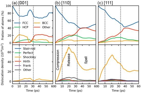 Variation of a fraction of atoms with time for different structures and dislocation density for (a) [001], (b) [110], and (c) [111] samples at a shock velocity of 1 km/s. The dashed lines demarcate the compression, release, and spallation stages of the shock process.