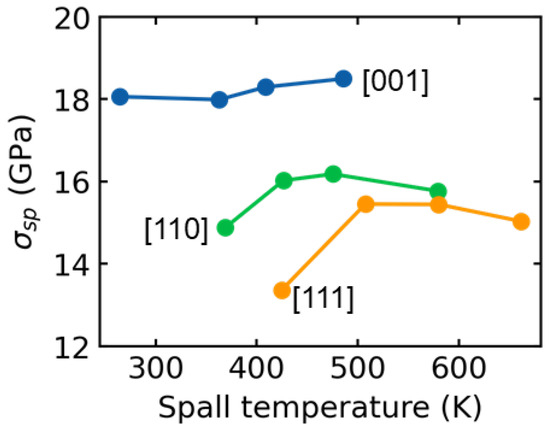 Relation of spall strength obtained from the bulk with the spall temperature for [001], [110], and [111] samples.