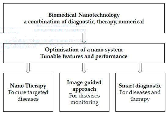 As indicated in Figure 1 (e.g., [15] modified by authors), biomedical nanotechnology is devoted to investigating nanoscience and nanotechnology for health well-being with the ultimate objective of providing individualized health management. The major role that technology plays in illness monitoring, treatment, and the control of progression has been validated by reports that have been made public by health organizations. Additionally, the application of nanotechnology-assisted methods improves the sensitivity, affordability, and accessibility of illness diagnosis and treatment methods [16,17,18].