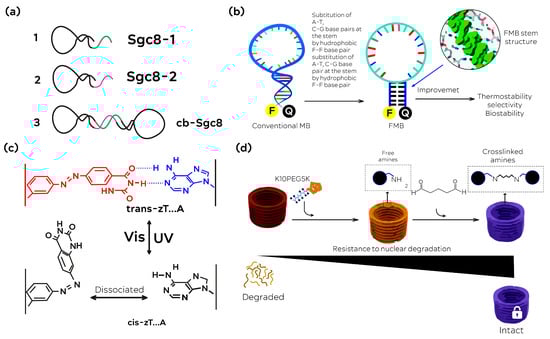 Improvement techniques for DNA-NMs and aptamers’ stability. (a) By ligating the 30 and 50 ends of the bivalent aptamers, a circle is created (1–3—steps of the process). (b) The use of fluorinated bases as useful nano molecules to enhance the stability of molecular beacons. (c) The new base pair pattern (zT-A) and the photosensitive base (zT). (d) PEGylated oligolysine-coated DNA-NMs with strong nuclease resistance are crosslinked with glutaraldehyde.