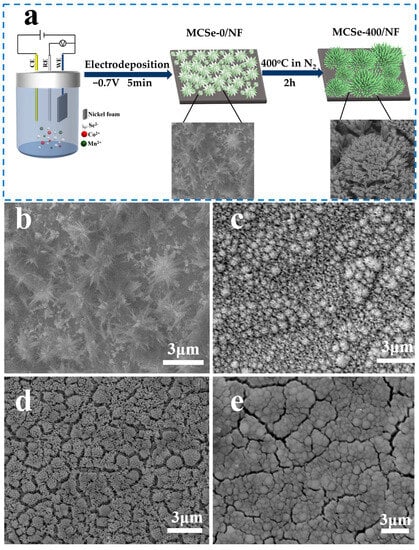 (a) Schematic diagram of the manganese cobalt bimetallic selenide electrode preparation process and SEM images of (b) MCSe-0, (c) MCSe-300, (d) MCSe-400, and (e) MCSe-500.