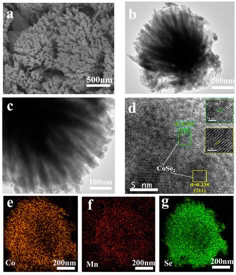 TEM analysis was performed to further study the microstructure of the MCSe-400 sample. As shown in Figure 2b, MCSe-400 exhibits a coral-like cluster structure, which is in good agreement with a high-resolution FESEM image of the same sample (Figure 2a). A magnified view (Figure 2c) shows that the coral-like clusters are composed of nanorods with lengths of approximately 400 nm and widths of approximately 30 nm. These nanorods are further composed of small particles. The coral-like structure of MCSe-400 results in numerous gaps between the nanorods, facilitating the penetration of electrolyte ions. This shows good promise for increasing the contact area between the electrode material and the electrolyte, resulting in better electrode utilization efficiency. HRTEM images (Figure 2d) show lattice fringes at distances of 0.205 nm and 0.238 nm, which correspond to the (121) crystal plane of orthorhombic CoSe2 and the (211) crystal plane of cubic CoSe2, respectively []. Figure 2e–g shows the elemental mapping images of the MCSe-400 sample, demonstrating that the elements Co, Mn, and Se are uniformly distributed on the surface of the electrode material.