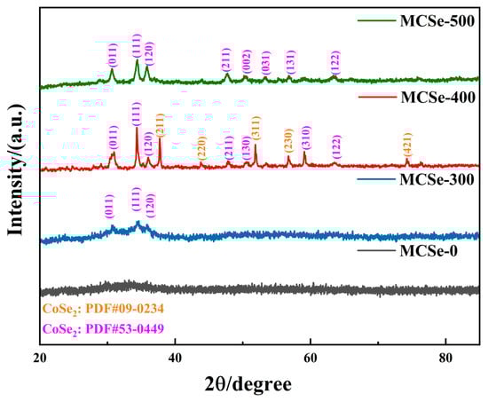 XRD analysis was used to analyze the crystal structure and composition of the prepared materials. As shown in Figure 3, the MCSe-0 sample does not exhibit any prominent diffraction peaks, indicating its poor crystallinity. However, the samples prepared with high-temperature heating exhibit significantly improved crystallinity. MCSe-300 shows diffraction peaks at 30.7°, 34.5°, and 35.9° corresponding to the (011), (111), and (120) crystal planes of the orthorhombic phase CoSe2 (PDF #53-0449), respectively. The MCSe-400 sample, prepared with a higher annealing temperature of 400 °C, shows two distinct sets of diffraction peaks corresponding to two different phases of CoSe2: orthorhombic CoSe2 (PDF #53-0449) and cubic CoSe2 (PDF #09-0234). Among them, the diffraction peaks located at 37.6°, 43.6°, 51.7°, 56.4°, and 73.9° correspond to the (211), (220), (311), (230) and (421) crystal planes of the cubic phase CoSe2, respectively. The diffraction peaks located at 28.9°, 34.5°, 35.9°, 47.7°, 50.6°, 59.2°, and 63.2° correspond to the (011), (111), (120), (211), (130), (310) and (122) crystal planes of orthorhombic phase CoSe2, respectively []. Moreover, the diffraction peak intensity of this sample is higher than that of MCSe-300, indicating improved crystallinity. After annealing at 500 °C, the MCSe-500 sample only exhibits diffraction peaks ascribed to orthorhombic phase CoSe2 (PDF #53-0449) [].