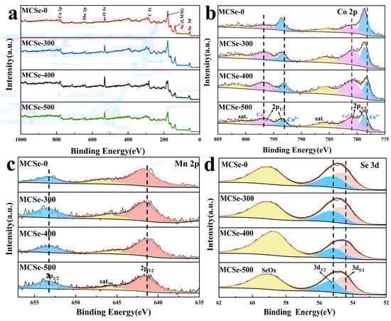 XPS analysis of the MCSe samples: (a) survey, (b) Co 2p, (c) Mn 2p, and (d) Se 3d spectra.