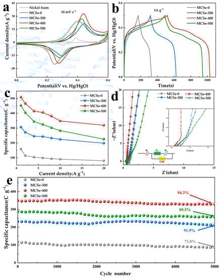 Figure 5a shows the CV curves of all the MCSe electrodes, and a pair of redox peaks can be observed for each electrode. The MCSe-400 electrode has a larger CV integral area, indicating higher specific capacitance compared to the other electrodes. A CV curve of the bare nickel foam substrate was also obtained. The integration area region of this CV curve is much smaller than the integration area of the CV curves of the MCSe electrodes, which indicates that the nickel foam substrate has a negligible effect on the electrochemical performance. GCD tests were conducted at 1 A g−1, as shown in Figure 5b. MCSe-400 demonstrates a longer discharge time than the other electrode samples, further confirming its superior electrochemical performance. The specific discharge capacities of all MCSe electrodes were calculated from the GCD curves as a function of current density, as shown in Figure 5c. At a current density of 1 A g−1, the discharge-specific capacity of the MCSe-400 electrode reaches 509 C g−1. When the current density was increased to 10 A g−1, the capacitance was retained by 68.6% (higher than the other MCSe electrodes), indicating the good rate capability of the MCSe-400 electrode. The specific capacitance values of the MCSe electrodes calculated on the basis of electrode area can be seen in Figure S1, where the maximum area specific capacitance of 1572 mF cm−2 is obtained for MCSe-400 at a current density of 1.5 mA cm−2. EIS tests were also performed, and the obtained Nyquist plots are shown in Figure 5d. As shown in the EIS circuit model, the intersection of the high-frequency region with the X-axis represents the electrolyte solution resistance (Rs), and the MCSe-400 electrode has the lowest internal resistance. The small, indistinct semicircle in these curves corresponds to the charge transfer resistance (Rct). The MCSe-400 electrode exhibits an Rct value of 0.53 Ω, which is lower than that of MCSe-0 (0.76 Ω), MCSe-300 (0.89 Ω), and MCSe-500 (0.98 Ω). This demonstrates the good conductivity of MCSe-400 compared to the other electrodes, which facilitates a rapid charge transfer. Compared to the other electrodes, the MCSe-400 electrode exhibits the steepest slope in the low-frequency region, indicating the lowest Warburg impedance (Zw), which in turn suggests that the electrode has the highest ion diffusion rate. To evaluate their long-term stability, the electrodes were tested for 5000 testing at 10 A g−1 (Figure 5e). After 5000 cycles, the MCSe-400 electrode retained 94.3% of its initial capacity, which was higher than that of the MCSe-0 (73.8%), MCSe-300 (91.9%), and MCSe-500 (89.5%) electrodes. The SEM image of the MCSe-400 electrode after long cycling can be seen in Figure S2. The coral-like structure can be noticed collapsed, which may be the reason for the capacity decay. In summary, the MCSe-400 electrode exhibits better stability than the other electrode materials. The optimal electrochemical performance of the MCSe-400 electrode material may be attributed to the fact that it contains orthorhombic phase CoSe2 which has more active sites and supports stronger OH− ion adsorption, thus providing a high energy storage capacity, and that it is a polycrystalline CoSe2 containing two crystalline phases, which has higher catalytic activity and better electrochemical performance than the pure orthorhombic phase CoSe2. The above are consistent with the results of existing theoretical calculations and experimental conclusions [,].