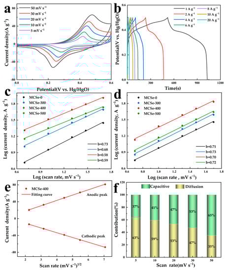Figure 6e shows the fitted curve of peak current versus square root of scan rate of the MCSe-400 electrode. The adjustable parameters k1 and k2 in the surface capacitance current () and diffusion control current () can be obtained from the curves. A calculation of the ratio between diffusion-controlled current and total current is shown in Figure 6f. Based on Figure 6f, the pseudocapacitive behavior of MCSe-400 is predominantly diffusion-controlled [,].