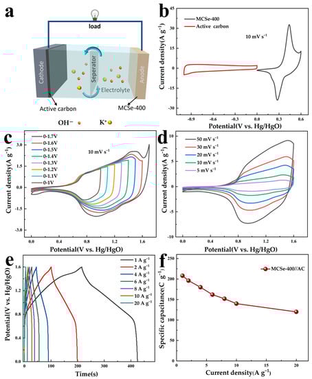 (a) Schematic diagram of MCSe-400//AC device structure. Electrochemical performance of MCSe-400//AC ASC: (b) CV curves of AC and MCSe-400 electrodes obtained at a scan rate of 10 mV s−1, (c) CV curves o at different voltage intervals with a scan rate of 10 mV s−1, (d) CV curves, (e) GCD curves, and (f) specific capacity at different current densities.