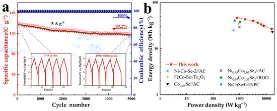 To achieve excellent charge storage performance, a charge balance (Q+ = Q−) was performed to determine that the optimized mass ratio of MCSe-400 to AC is 2.01. The charge balance formula is found in the supporting information. As shown in Figure 7c, under a scan rate of 10 mV s−1, CV curves with similar shapes are obtained and no significant polarization is observed when the potential window is expanded from 1 V to 1.6 V. However, when the potential window is further expanded to 1.7 V, noticeable polarization can be observed. Therefore, the voltage range of this ASC device was selected to be 0–1.6 V. Figure 7d shows the CV curves of the MCSe-400//AC device at different scan rates. Well-shaped CV curves are obtained under scan rates of 5–50 mV s−1, indicating that the MCSe-400//AC ASC device exhibits good rate performance. GCD curves of the MCSe-400//AC device were obtained at current densities ranging from 1 to 20 A g−1, as shown in Figure 7e. Charge–discharge plateaus are visible in all the GDC curves, which is consistent with the formation mechanism of the oxidation and reduction peaks in the CV curves. The specific capacitance of the MCSe-400//AC device is 208 C g−1 at 1 A g−1. Even at a high current density of 20 A g−1, a specific capacitance of 120 C g−1 can still be maintained (Figure 7f), indicating the excellent rate performance of this device. The cycling stability of the MCSe-400//AC ASC was evaluated over 5000 cycles at 5 A g−1, as shown in Figure 8a. After testing, the MCSe-400//AC ASC still retains 89.2% of its initial specific capacitance, indicating good cycling stability. Throughout this cycling test, the Coulombic efficiency of the electrode remains close to 100%, indicating the good reversibility of the surface redox reactions. The charge–discharge curves for the cycles of 1–5 and 4996–5000 are shown in the Figure 8a inset. The charge–discharge region of this curve shows clear bending, indicating that the capacity of this electrode originates from the redox reactions. No significant changes can be observed in the curve shape even after 5000 cycles, further confirming the excellent cycling performance of the MCSe-400//AC ASC. The specific energy and specific power of the MCSe-400//AC device were also calculated. As shown in the Ragone plot (Figure 8b), the MCSe-400//AC device exhibits specific energy of 46.2, 43.5, 36, 31.1, and 26.6 Wh kg−1 at specific powers of 800, 1600, 5000, 8000, and 16,000 W kg−1, respectively. The specific energy and specific power calculation formulas can be found in the supporting information. Overall, the performance of the MCSe-400//AC device surpasses that of other dual-transition metal selenide supercapacitor devices [,,,,,].