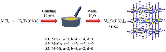 Prussian blue, Fe4[Fe(CN)6]3·nH2O, is a mixed-valence compound that contains both ferrous (Fe2+) and ferric iron (Fe3+) [15]. Cyanide ions serve as a bridge between the iron ions, which are arranged alternately in a face-centered cubic lattice. Each Fe3+ and Fe2+ ion has octahedral geometry; Fe3+ and Fe2+ ions are surrounded by nitrogen and carbon of cyanide ions, respectively. Due to the 3:4 ratio of Fe2+ and Fe3+ sites in the lattice, there is a 25% vacancy of [Fe2+(CN)6]4− clusters. There is a vacant 12-fold cuboctahedral position where alkali metals can be inserted, creating double perovskite like the structure of Prussian blue analogs (PBAs). The generic formula of Prussian blue analogs (PBAs) is represented as ApM(a)[M(b)(CN)6]y·mH2O, (M(a), M(b) = Fe, Mn, Co, Ni, Cu, Zn, and A = Li, Na, K, Rb) where M(a) and M(b) are the metal ions coordinated to cyano groups and A cations are intercalated between the frameworks. Prussian blue was synthesized through gas-phase synthesis, solution-phase synthesis, and template synthesis [16,17]. However, the preceding methods entail the following problems: long synthetic time, solvents, other chemicals (such as surfactants or templates), complex process control and steps, or high reaction temperature or pressure. By contrast, solid-phase synthesis can be completed in one step at room temperature without using solvents. By modifying both cation and anion defect sites, it is possible to create a variety of fascinating functions in materials, including band structure, magnetism, conductivity, and catalysis.