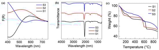 Characterization of S1, S2, and S3. (a) Absorption spectra, (b) FTIR spectra, and (c) thermogravimetric analysis (TGA).