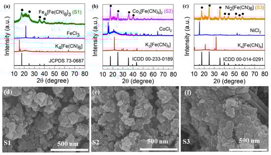 To confirm the complete conversion of PBA from the respective precursor salts, we performed PXRD, XPS, and SEM. The PXRD patterns of S1, S2, and S3 are depicted in Figure 3a–c. Notably, we did not observe any peaks corresponding to the precursors (FeCl3 and K4[Fe(CN)6]) used in the synthesis of Prussian blue in the resulting product (Figure 3a–c).