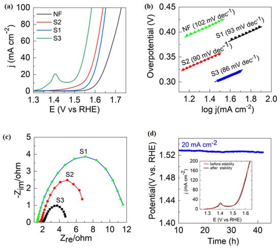 Electrocatalytic measurements of S3 for OER. (a) OER polarized curves for S1, S2, S3, and NF in 1 M KOH, (b) the corresponding Tafel plots for the OER, (c) Nyquist plots obtained, (d) chronopotentiometry curves of S3 at the current density of 20 cm−2; inset in (d) shows polarization curves of S3 before and after 40 h of stability.