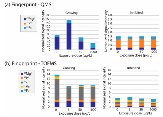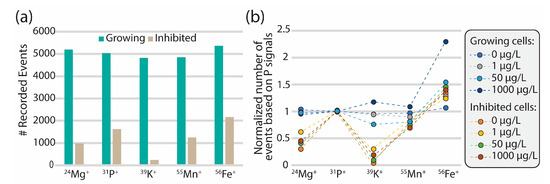 Normalized elemental cellular fingerprints for the freshwater green algae R. subcapitata measured by (a) sc-ICP-QMS and (b) sc-ICP-TOFMS for growing and inhibited populations. Signals were normalized using the median of P signal intensity as a reference. Note that the error bars were removed here to facilitate the visualization of the trends. Figures with error bars can be found in Figure S9 in the Supplementary Information.