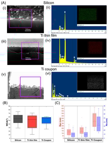 (A) Scanning electron microscope (SEM) energy dispersive X-ray (EDX) data of substrates post activation: (i) Cross-sectional SEM image of a silicon substrate with area of EDX mapping highlighted in pink, (ii) corresponding EDX spectrum and insert of elemental map of sodium, (iii) cross-sectional SEM image of a Ti thin-film substrate with area of EDX mapping highlighted in pink, (iv) corresponding EDX spectrum and insert of elemental map of sodium, (v) cross-sectional SEM image of a Ti coupon substrate with area of EDX mapping highlighted in pink, (vi) corresponding EDX spectrum and insert of elemental map of sodium. (B) Water contact angle (WCA) in ° measured for each substrate post activation; (C) the average roughness (Ra) and peak-to-valley (Rpv) roughness of the three substrates post-activation as measured by atomic force microscopy.
