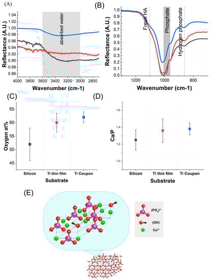 (A,B) Fourier-transform infrared spectra (FTIR) (A) in the absorbed water region of 4000–2000 cm−1 and (B) in the phosphate region of 1300–700 cm−1 of the full deposited HA layer over all three substrates: silicon (grey line), Ti thin film (red line), and Ti coupon (blue line). (C,D) Collated electron-dispersive X-ray (EDX) data showing mean and error bars for the atomic percentage of (C) oxygen (O at%) and (D) calcium-to-phosphorus atomic percentage (Ca/P) found in the HA film deposited over silicon, Ti thin film, and Ti coupon parts. (E) Crystal structure of hydroxyapatite. For better visualisation, some atoms have been removed from the diagram. The diagram has been constructed from the literature [74,75].