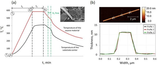 (a) An example of temperature profiles measured in real-time prior to the synthesis of Bi2Se3 nanostructures under the same conditions (temperature, time, and pressure) as for the synthesis of the nanostructures: at the center of the furnace (location of the Bi2Se3 source material—solid red line) and at the center of the substrate (the region where the stoichiometric Bi2Se3 nanoribbons are obtained—solid black line); Inset—secondary electron SEM image of a Bi2Se3 nanoribbon growing from the edge of Bi2Se3 nanoplate-seed; (b) atomic force microscope image of ~10 nm thin Bi2Se3 nanoribbon (top) and height profiles at three different positions demonstrating an identical shape and thickness of the cross-section of the nanoribbon (bottom).