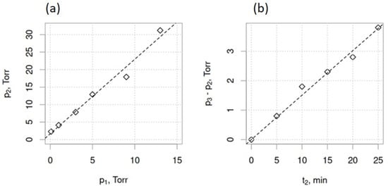 Charts illustrating relation between the (a) pressure p2 at the end of the furnace heating to maximal synthesis temperature and the initial pressure p1, and (b) between the heating time t2 of the source material at maximal temperature Tm and the pressure increase during the t2 time. All p1, p2, and p3 measurement errors did not exceed 1% of the measured value.