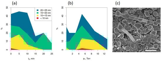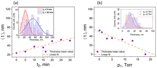 Generally, the mean thickness of the nanoribbons linearly decreased with the decrease in the source material heating time t2 while keeping the pressure p1 constant (Figure 3a, and the green part of Table 1, including row 9), which is most likely related to the decreased amount of the evaporated source material, and consequently, the thickness of the nanoplate seeds. In contrast, an increase in the initial pressure p1 while keeping t2 constant resulted in a slight decrease in the mean thickness ⟨t⟩ of the nanoribbons from ~50 nm down to 0 nm when the p1 increased from 0.1 to 18 Torr (Figure 3, blue part of Table 1, including row 9).