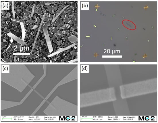 (a) Secondary electron SEM image of grown freestanding Bi2Se3 nanoribbons on a glass substrate. (b) Optical image of transferred nanoribbons to Si/SiO2 substrate. The red circle highlights the nanoribbon (15 nm thick) selected for further fabrication. (c) SEM image of Bi2Se3 nanoribbon-based (from (b)) device with patterned electrodes for the Hall-effect measurement; (d) Hall bars overlapping the Bi2Se3 nanoribbon; this configuration requires a correction factor g when calculating the n3D-Hall concentration.