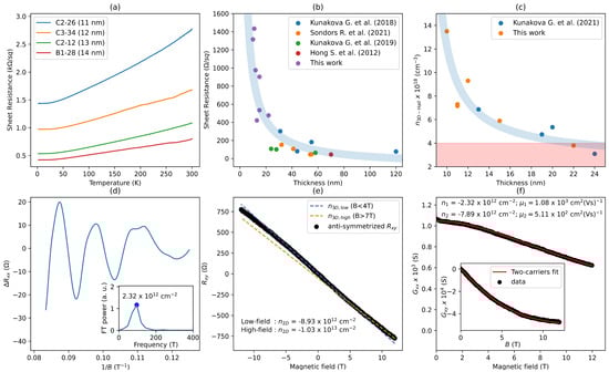 Magnetotransport of Bi2Se3 nanoribbons with thickness below 15 nm. (a) Sheet resistance as a function of temperature; (b) Sheet resistance as a function of nanoribbon thickness measured at 2 K. Purple marks are data from this work, the colored marks (blue, orange, green and red) are data from Kunakova G, et al. (2018) [26], Sondors R. et al. (2021) [36], Kunakova G, et al. (2019) [41] and Hong S. et al. (2012) [24], respectively. The light-blue shaded region is a guide to the eye (1/t), indicating a dramatic increase in sheet resistance as thickness decreases; (c) The three-dimensional concentration of charge carriers n3D-Hall as a function of nanoribbons thickness. Orange marks are data from this work; the blue marks are data from Kunakova G, et al. (2021) [39], respectively. The light-blue shaded region is a guide to the eye, and the pink-shaded region indicates the upper bound for the bulk carrier concentration [26]; (d) Shubnikov–de Haas magnetoresistance oscillations as a function of 1/B for the 15 nm-thick nanoribbons measured at 2 K. The inset: the Fourier transform power spectra of ∆Rxx(1/B) shown in (d); (e) Anti-symmetrized Rxy(B). The blue dashed lines are the linear fit in the range of 0 to 4 T. The orange dashed lines are the linear fit in the range of 7 to 12 T. (f) Longitudinal (Gxx) and transverse (Gxy) magnetoconductance as a function of the magnetic field. The solid red lines correspond to the fit of the two-carrier model. All the data refer to the same nanoribbon as shown in (d).