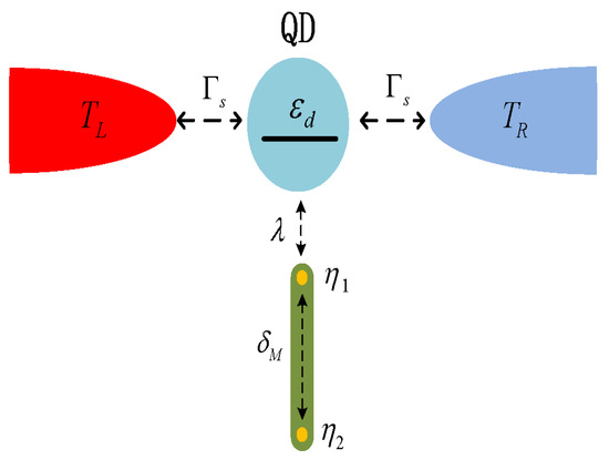 where the first term in the right of Equation (1) is for the QD with quantized energy level and creation (annihilation) operator . The second and third terms are for the superconductors acting as leads with energy gap , quasi-particle energy (, spin , wave vector k) and creation (annihilation) operator [6,8,47,48]. The forth term in the right side of Equation (1) stands for hopping between the QD and the superconductors with amplitude and phase factor . The last term in the right of Equation (1) is for the MBSs formed at the ends of the nanowire and their interaction with the QD [46,47,48,49,50],