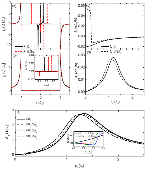 and . The matrix , and the elements of the diagonal matrix are and . The lesser self-energy due to the superconductors are given by . The quantity is the Fermi-Dirac distribution function with the Fermi energy in the -th superconductor, Boltzmann constant , temperature in the left/right superconductors , in which T the system equilibrium temperature and the temperature difference that induces thermoelectric effect. After expanding J in Equation (5) with respective to and to the first order and taking Equation (4) into consideration, one obtains [6,8],