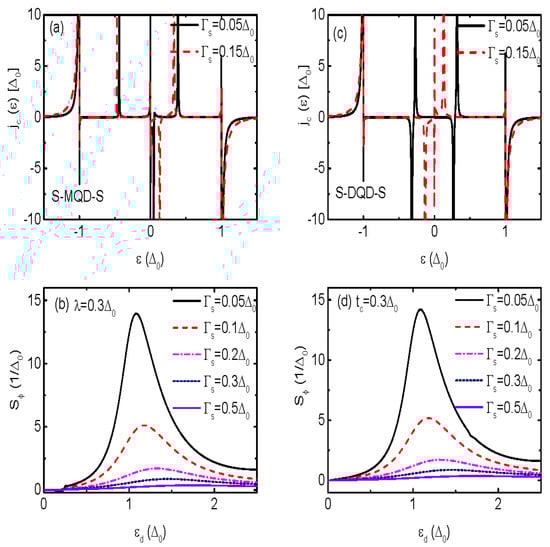 The coupling strength between the QD and the superconductors induces particle-hole splitting of the effective quasiparticle states formed at [51]. With increasing value of , the broad peaks in around then are shifted individually to deeper and higher energy regimes, respectively. Therefore, the current’s contribution from the state around becomes weaker, resulting in reduced . As for the CCDOS , the splitting of the effective quasiparticle states has less impact on it. It is found that the peaks’ positions in for both S-MQD-M in Figure 4a and S-DQD-S in Figure 4b are shifted by , but with negligibly small change in magnitude. We note that in the present case, the TPSC does not its sign in either S-MQD-S or S-DQD-S, which are shown in Figure 4b,d. The reason is that mainly induces splitting of the effective quasiparticle states and variation of the peaks’ position in [51]. Both of these two effects will not result in sign change of the current. Moreover, Figure 4b,d indicate that the magnitude and line-shape of in the two types of structures are almost the same regardless of the value of .