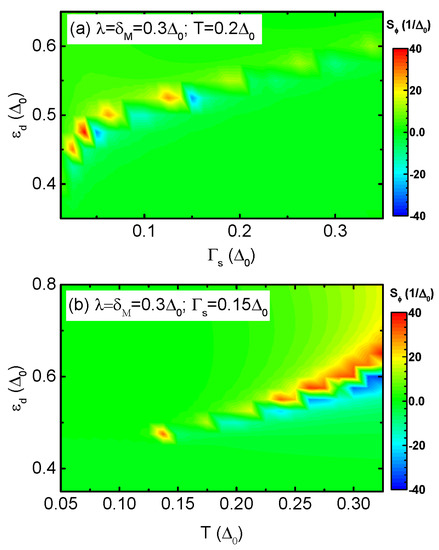 The change of from positive to negative value induced by , which may indicate the presence of MBSs, is rather weak in magnitude and occurs in a narrow dot level regime. This is then difficult to be detected in experiments. The two modes of MBSs overlaps to each other with an amplitude depending on the Majorana nanowire’s length, i.e., where denotes the length of the nanowire and the superconducting coherence length. In previous work [39], López et al. found that in NM-MQD-NM will lead to sign reversion of the thermopower. The reason is that in the presence of dot-MBSs coupling , the Majorana level and dot level repels each other. In the present S-MQD-S device, we find in Figure 5a that there are a series of zero points in the TPSC , at whose two sides emerge sharp peaks with opposite signs. Moreover, the positions of the zero points as well as the peaks are almost linear with either dot level or Majorana level , which can be seen more clearly in Figure 5b,c. As is shown in Figure 5b, the zero point in emerges given that , and two sharp peaks with opposite signs emerge at the two sides of each zero point. As is compared to the case of , the peak’s height is also significantly enhanced. The relation between and is confirmed by the results shown in Figure 5c, in which the zero points in emerge at about .