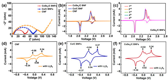 In order to further explore the intrinsic mechanisms behind the enhanced electrochemical performance of the CoSe2/C BNF-S electrode, EIS was utilized to gain insight into the charge transfer properties of CNFs-S, Co/C BNFs-S, and CoSe2/C BNFs-S. Figure 4a shows the Nyquist plots of the different electrodes at the initial state of the half-cell, all of which are presented with a semicircle in the higher frequency range and a diagonal line in the lower frequency region. The diameter of the semicircle in the higher frequency range corresponds to the charge transfer resistance, while the diagonal line in the lower frequency region signifies the semi-infinite Warburg diffusion of Li+ within the electrode [37]. From the EIS results, it can be inferred that the charge transfer resistance of the CoSe2/C BNF-S electrode is significantly smaller than that of the Co/C BNF-S electrode and CNF-S electrode, suggesting that the CoSe2 could accelerate the reaction kinetics of the LiPSs conversion.