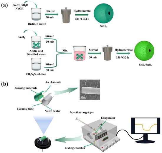 The gas sensor was fabricated as follows. Firstly, a homogeneous slurry of either SnO2 or SnS2/SnO2 was prepared by dispersing the synthesized products (40 mg) in ethanol. This slurry was then coated onto the surface of an Al2O3 ceramic tube (4 mm in length, 1.2 mm in external diameter, and 0.8 mm in internal diameter). At each end of the Al2O3 ceramic tube, there were two Au electrodes, which were connected to two Pt lead wires. After natural drying, a Ni–Cr alloy coil was inserted through the central tunnel of the ceramic tube to act as a heater and regulate the operating temperature of the gas sensor. The Pt lead wires and the Ni–Cr heating wire were soldered on a four-corner base to fabricate the gas sensor. To enhance the stability and repeatability of the fabricated gas sensor, it was aged on a TS60 desktop (Winsen Electronics Co., Ltd., Zhengzhou, China) at 200 °C for 48 h. The gas-sensing tests were carried out in a static system (Weisheng Tech Co., Ltd., Zhengzhou, China) at room temperature. This work defines the sensor’s response as the resistance ratio, S = Ra/Rg (Rg: resistance in testing gas, Ra: resistance in the air). The schematic diagram of the synthesis process of the SnS2/SnO2 composites and the fabricated gas sensor is illustrated in Figure 1.