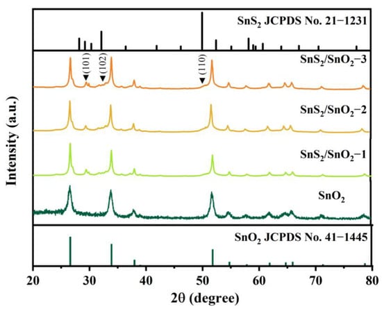 Furthermore, the crystal structures of the SnO2 and SnS2/SnO2 samples were analyzed using XRD. As shown in Figure 3, the diffraction peaks of the SnO2 hollow spheres at 2θ of 26.6°, 33.9°, 38.9°, 51.8°, and 54.7° correspond to the (110), (101), (111), (211), and (220) crystal planes of SnO2, respectively, which is in good agreement with the tetragonal SnO2 phase (JCPDS No. 41–1445). After the sulfurization of SnO2, all the crystal phases belong to SnO2 and SnS2, confirming the formation of SnS2/SnO2 composites. Apart from the peaks belonging to pure SnO2, the weak diffraction peaks at about 29.3, 32.1, and 50.1° are assigned to the (101), (102), and (110) planes of SnS2 (JCPDS no. 21–1231). Additionally, no excess impurity peaks indicate the high purity of the as-synthesized samples.