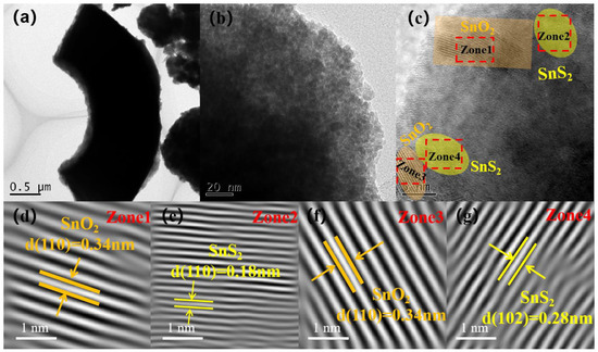 In order to further investigate the internal microstructure and crystal structure of the SnS2/SnO2 composites, TEM and HRTEM analyses were conducted (Figure 4), which revealed that the material has a hollow spherical structure observed from the broken material (Figure 4a). Moreover, a loose and porous surface can be observed in Figure 4b, which is in accordance with the results of the FE–SEM analyses. Figure 4c–g illustrates well-defined lattice stripes of the SnS2/SnO2 composites. The crystallographic distances of 0.34, 0.18, and 0.28 nm correspond to the (110) crystallographic planes of SnO2, and the (110) and (102) crystallographic planes of SnS2, respectively. These values align with the dominant peaks observed in the XRD patterns. Furthermore, the lattice stripes observed between SnS2 and SnO2 exhibit a seamless continuity, indicating the successful formation of an n–n heterojunction.