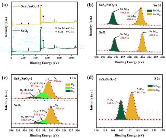 XPS spectra of SnO2 and SnS2/SnO2−2 samples. (a) Survey spectrum, (b) Sn 3d spectrum, (c) O 1s spectrum, and (d) S 2p spectrum.