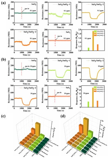 Gas-sensing properties of the sensors at room temperature: dynamic response recovery curve and corresponding response of SnO2, SnS2, and SnS2/SnO2 hollow spheres at room temperature to (a) 0.1 ppm formaldehyde and (b) 10 ppm formaldehyde; selectivity of SnO2 and SnS2/SnO2 sensors to six different gases at room temperature at (c) 0.1 ppm and (d) 10 ppm.