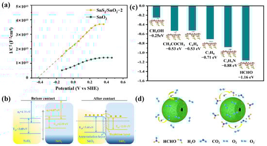 (a) Mott–Schottky plots of the SnO2 and SnS2/SnO2−2 hollow spheres; (b) energy band structure diagram of the SnS2/SnO2 heterojunctions; (c) DFT-calculated adsorption energies of the SnS2/SnO2 heterojunction surface; (d) schematic diagram of sensing mechanism of SnS2/SnO2 hollow spheres in air and formaldehyde.
