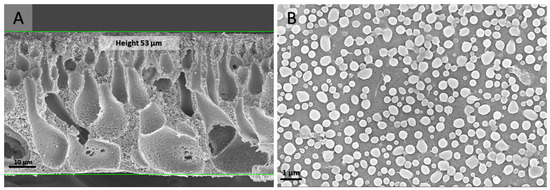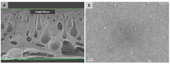 SEM micrographs of the cross-section (A) and top view (B) of a pristine PS-b-PDMAEMA membrane fabricated via the NIPS process.