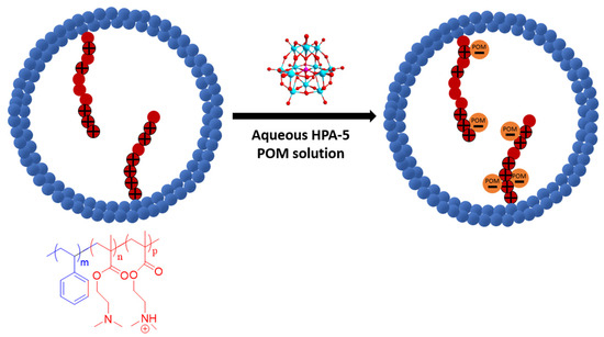 Vanadium(V) oxide (99.6%), molybdenum(Vl) oxide (99.5%), aqueous phosphoric acid solution (85% w/w) and H2O2 aqueous solution (30% w/w) for the synthesis of the HPA-5 (H8[PV5Mo7O40]) were purchased from Alfa Aesar (ThermoFisher GmbH, Kendel, Germany). The styrene (≥99%) and 2-(Dimethylamino)ethyl methacrylate (98%) (DMAEMA) monomers were purchased from Sigma-Aldrich (Sigma-Aldrich CHEMIE GmbH, Steinheim, Germany). Formic acid methyl ester (97%) was purchased from Sigma-Aldrich (Merck KGaA, Darmstadt, Germany). D-(+)-Glucose (≥99.5%) and HPLC grade methanol for catalytic reaction were obtained from Sigma-Aldrich (Sigma-Aldrich CHEMIE GmbH, Steinheim, Germany) and VWR Chemicals (VWR International, Fontenay-sous-Bois, France), respectively.